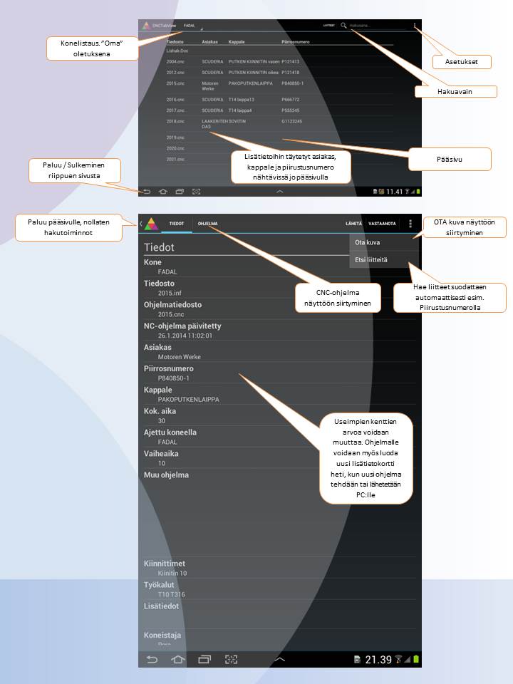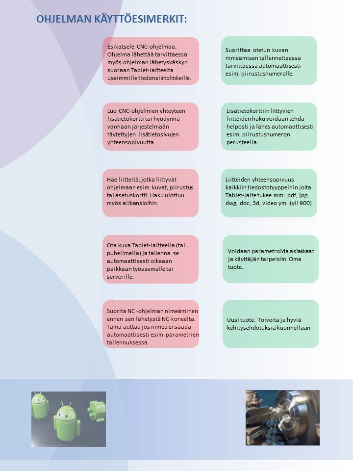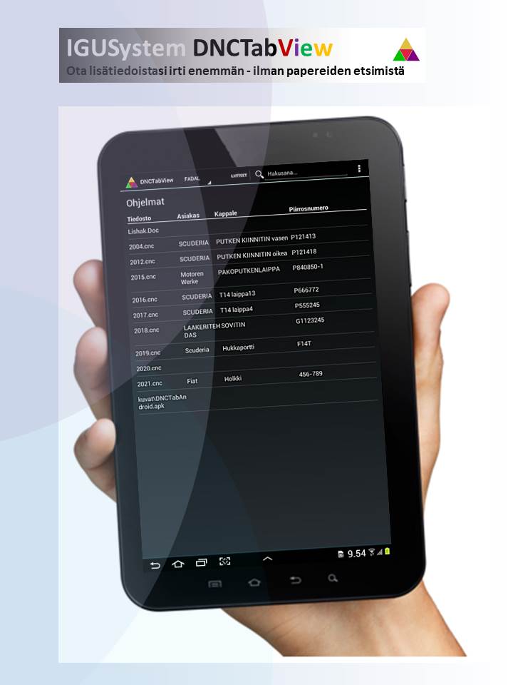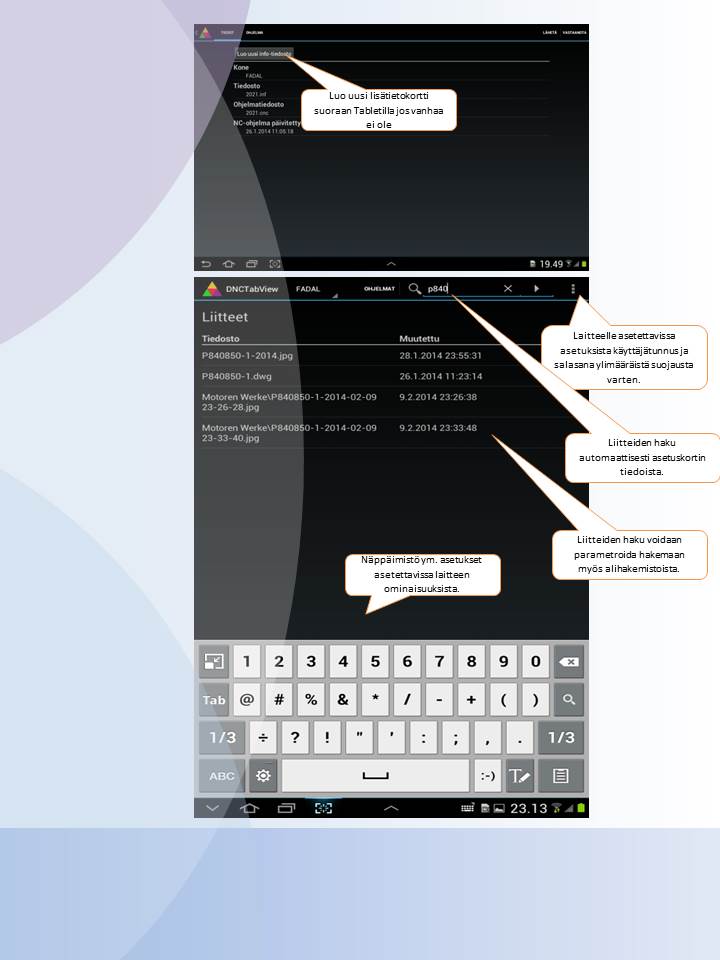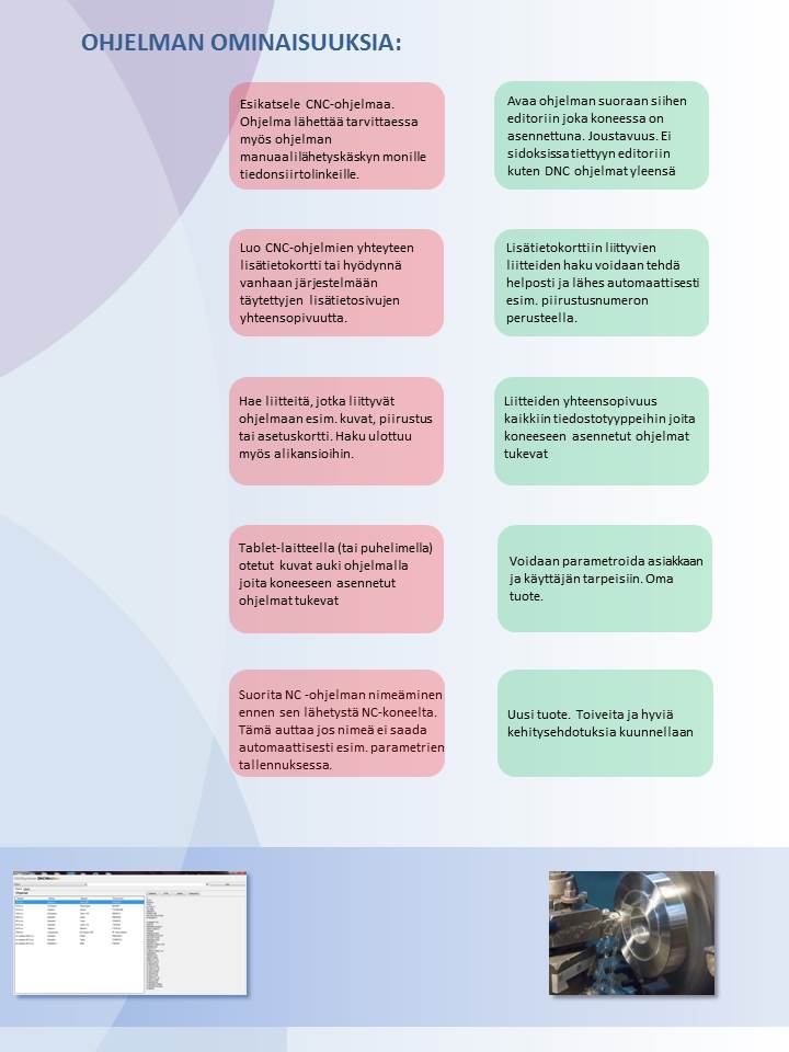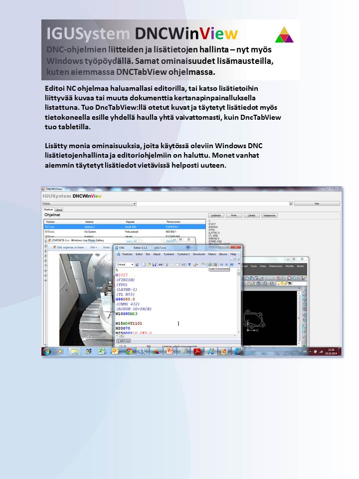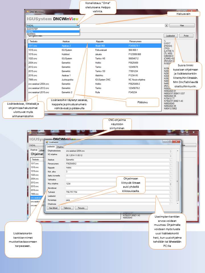 DNCWinView sovellus NC-ohjelmiin liittyvien lisätietojen ja liitteiden hallintaan. Kokonaisuus yhdessä Android version kanssa tekee lisätietojen ja kiinnityskuvien hallinnasta helppoa. Vanhat täytetyt lisätiedot voidaan sopeuttaa tälle. mm. Windnc32.
