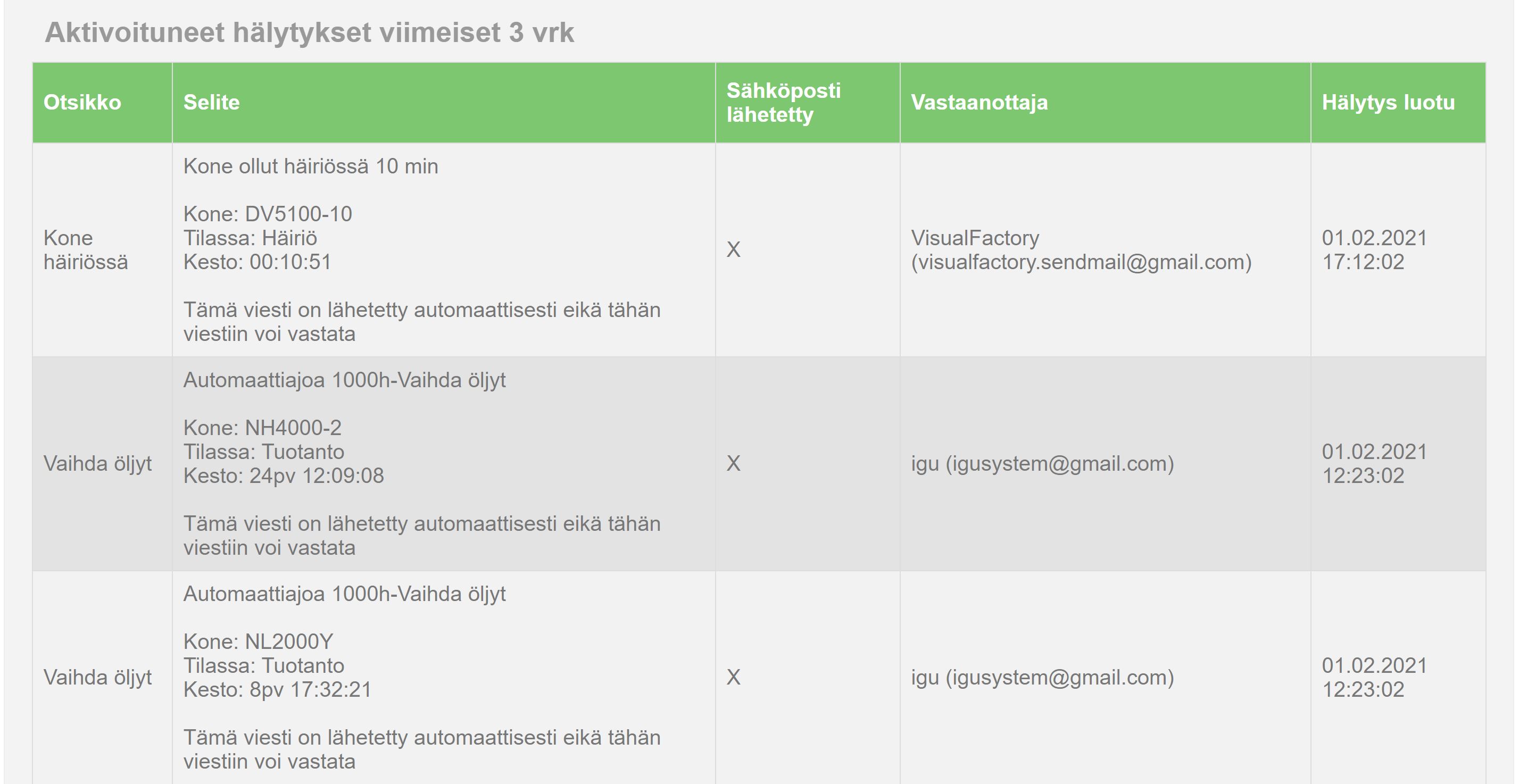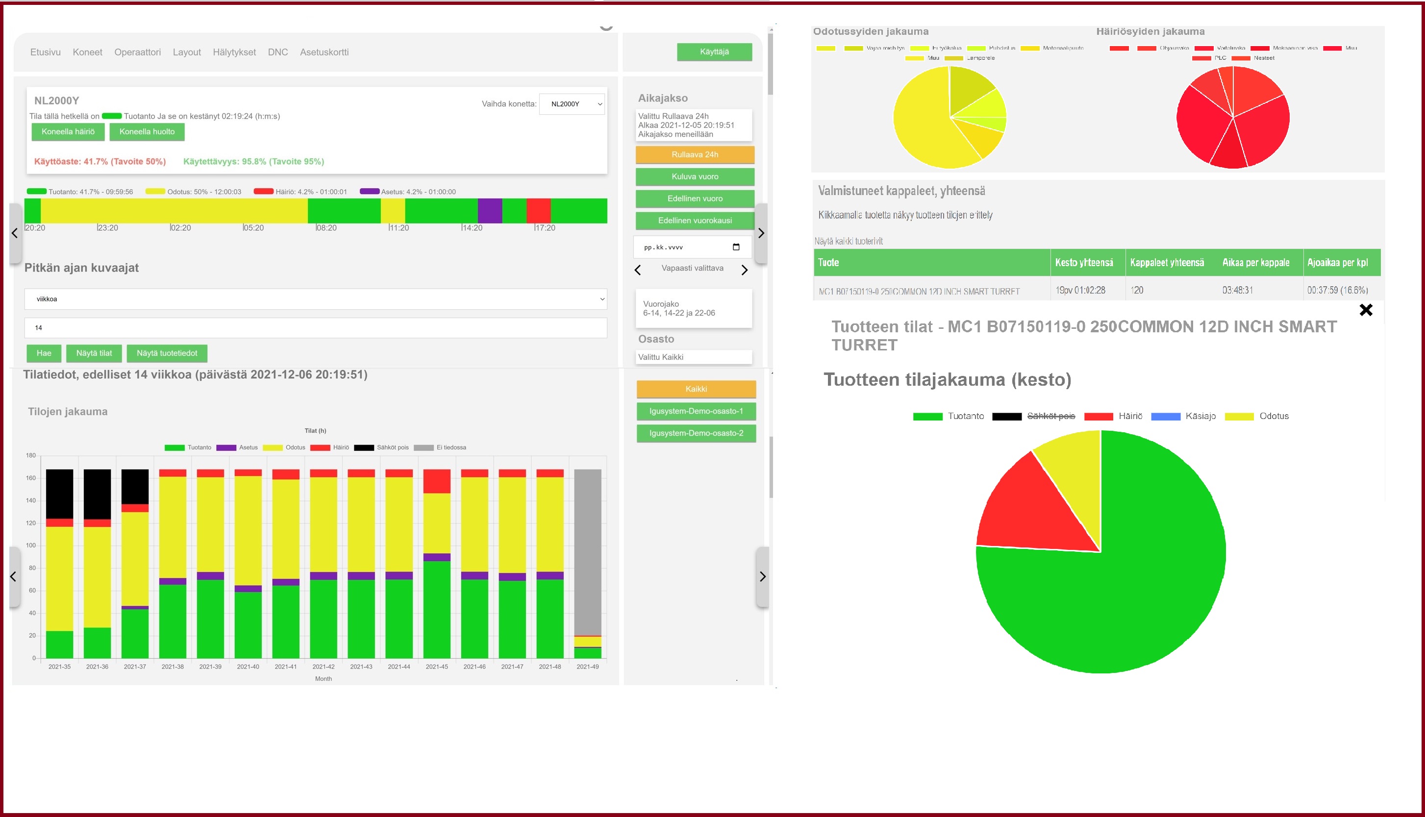 MTConnect ja igulink linkeillämme keräämämmme datan murskaamiseen sovellus, yhteistyökumppanimme Visual Factory, johon on laitettu samaan pakettiin kaikki nykyaikaisen tiedonkeruun datanesittämisominaisuudet. Tuote- ja kpl tieto kerätään useimmin suoraan NC-koneilta verkon yli jolloin voidaan tarkastella tuotantodataa entistä tarkemmin. Kevyempiin langattomiin seurantoihin voimme toteuttaa kotimaisen Ruuvi tag:n avulla tehtävä keruu tai sähkönkulutuksen mittauksen yhdistämällä sen tuotantodataan. Ilmoitukset myös puhelimeen mistä vaan tilatiedosta keston, esiintymättömyyden tai kokonaiskeston mukaan.