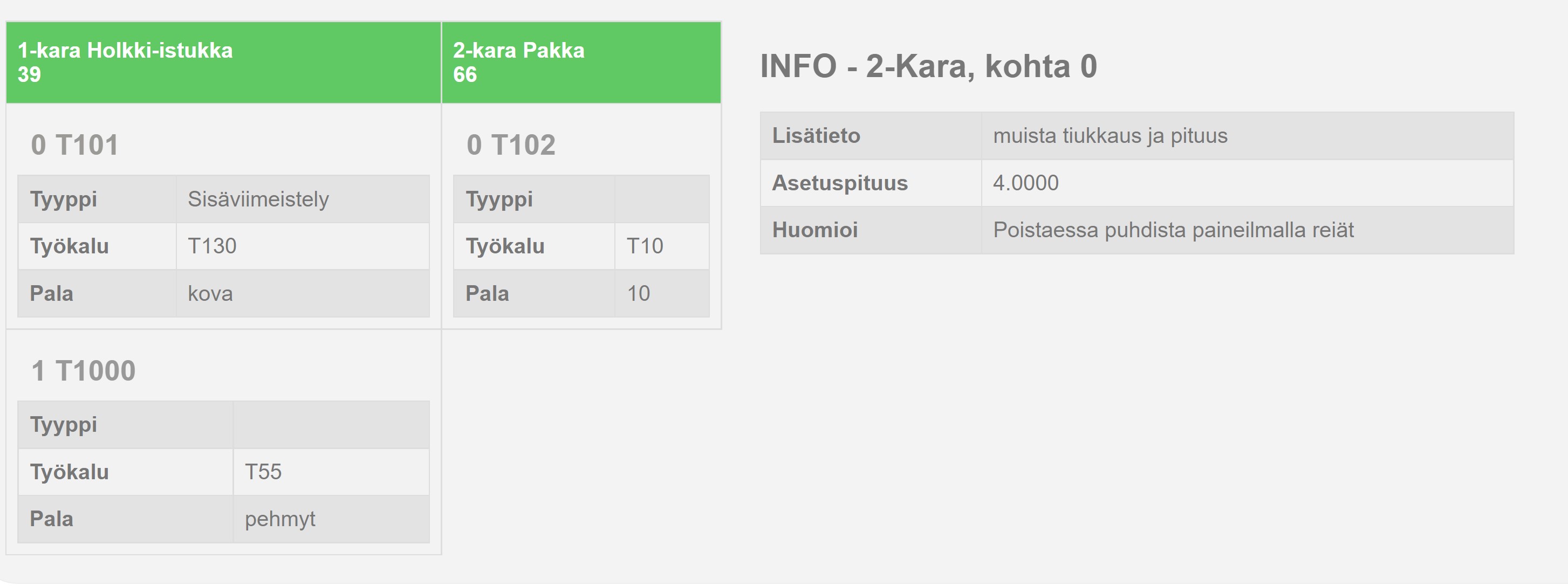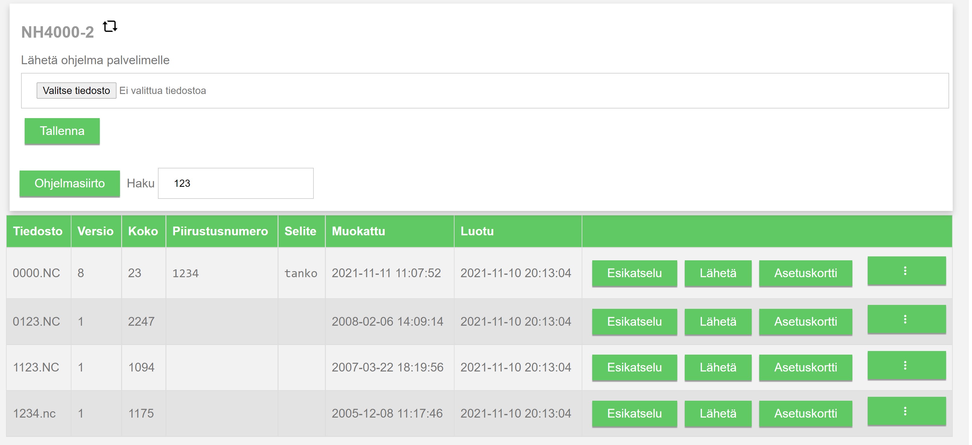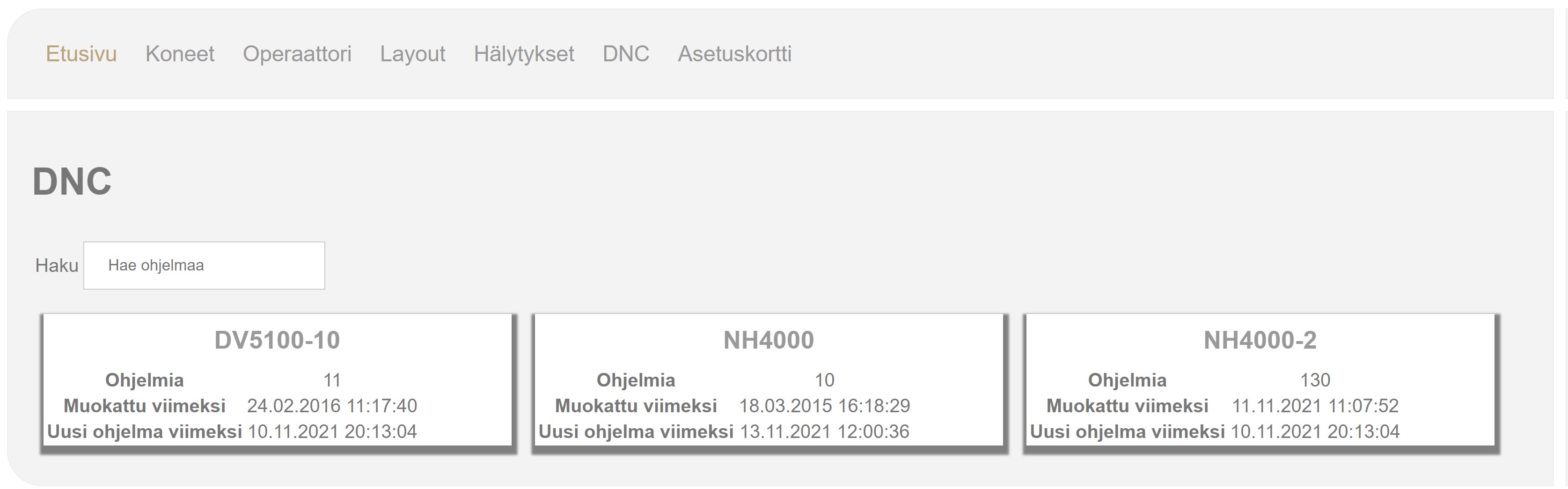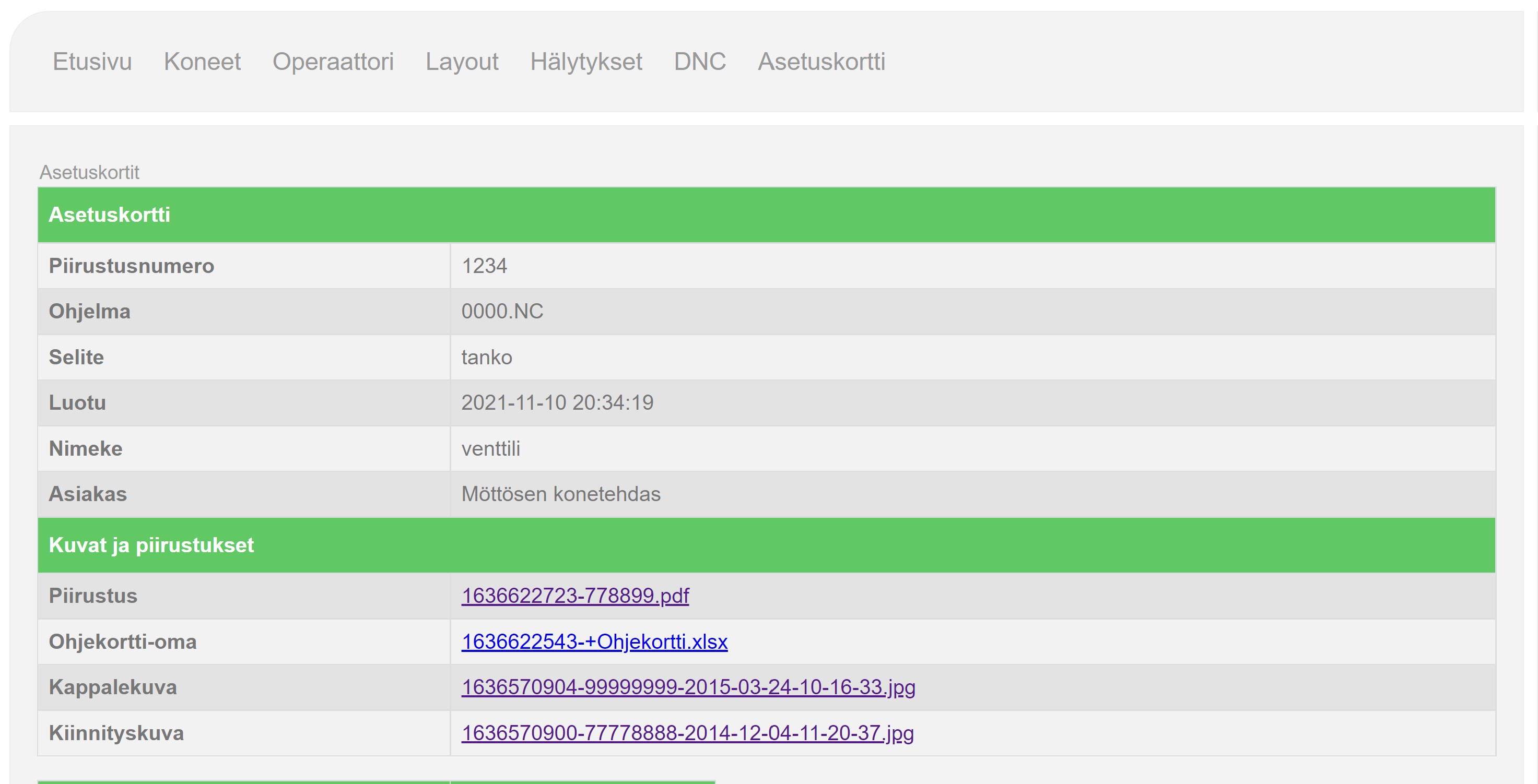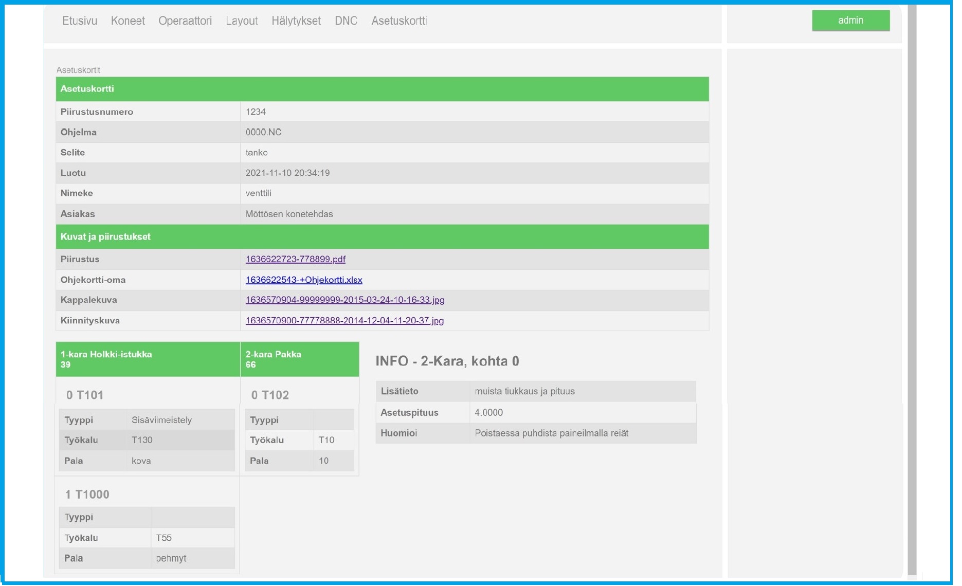 Teimme VisualFactoryyn myös tietokantapohjaisen NC-ohjelmien ja lisätietojen hallintajärjestelmän, jolla hallitaan suuria NC-ohjelman ja lisätietokokonaisuuksia jokaiselle omalla räätälöitävällä asetuskortilla. Tällä voidaan siirtää myös työstöohjelmat vanhoille ja uusille linkeille tai suoraan NC-koneille. Selainpohjainen ja siten käyttöjärjestelmästä riippumaton. Mm Tab.