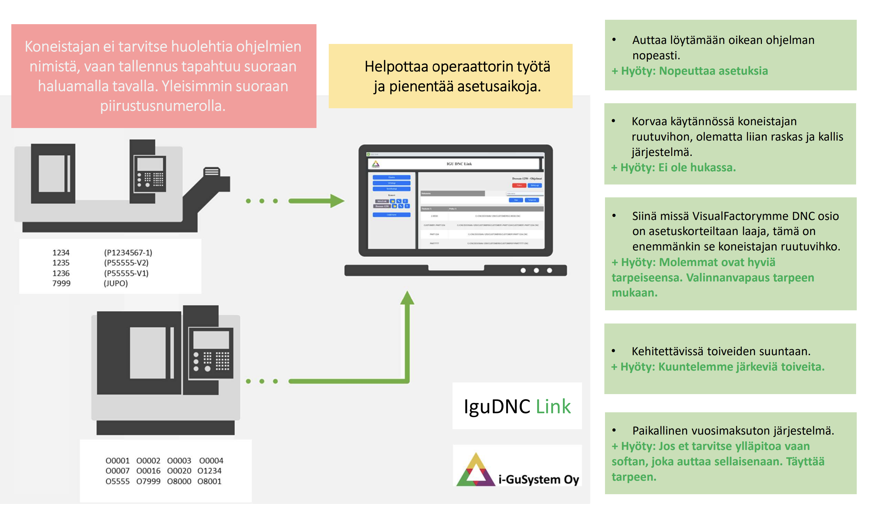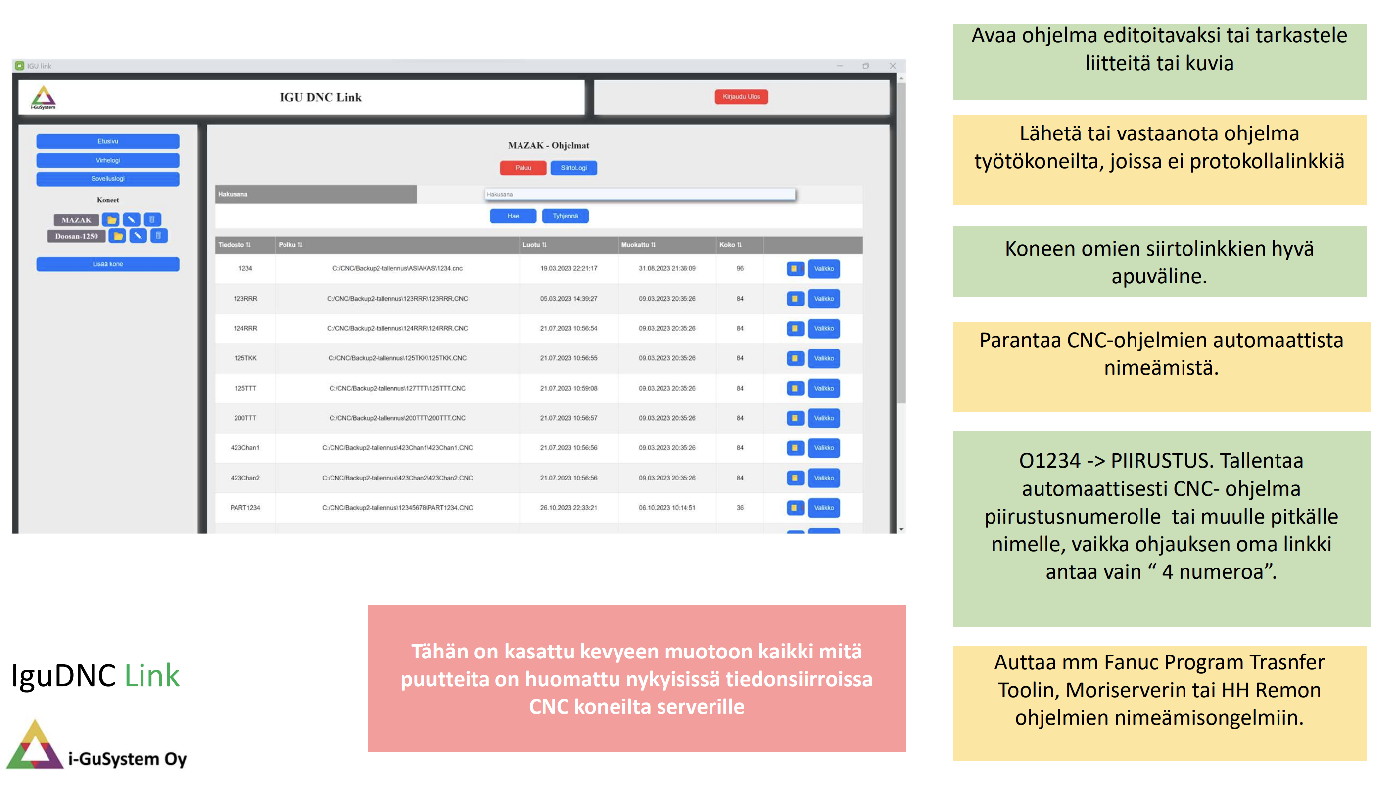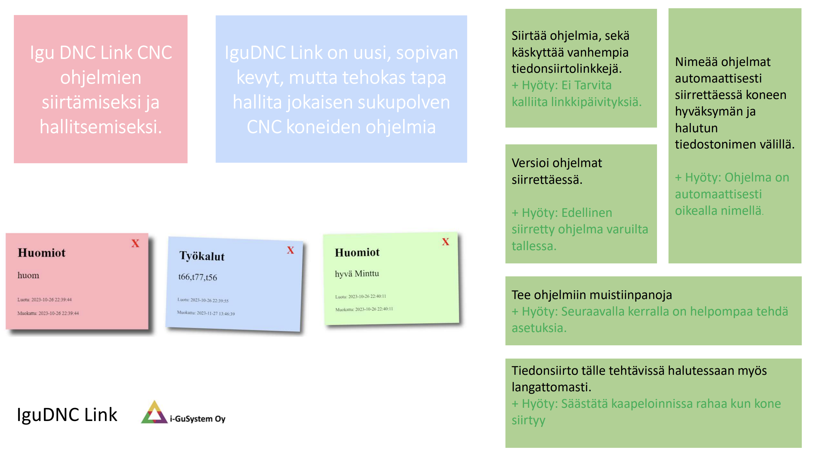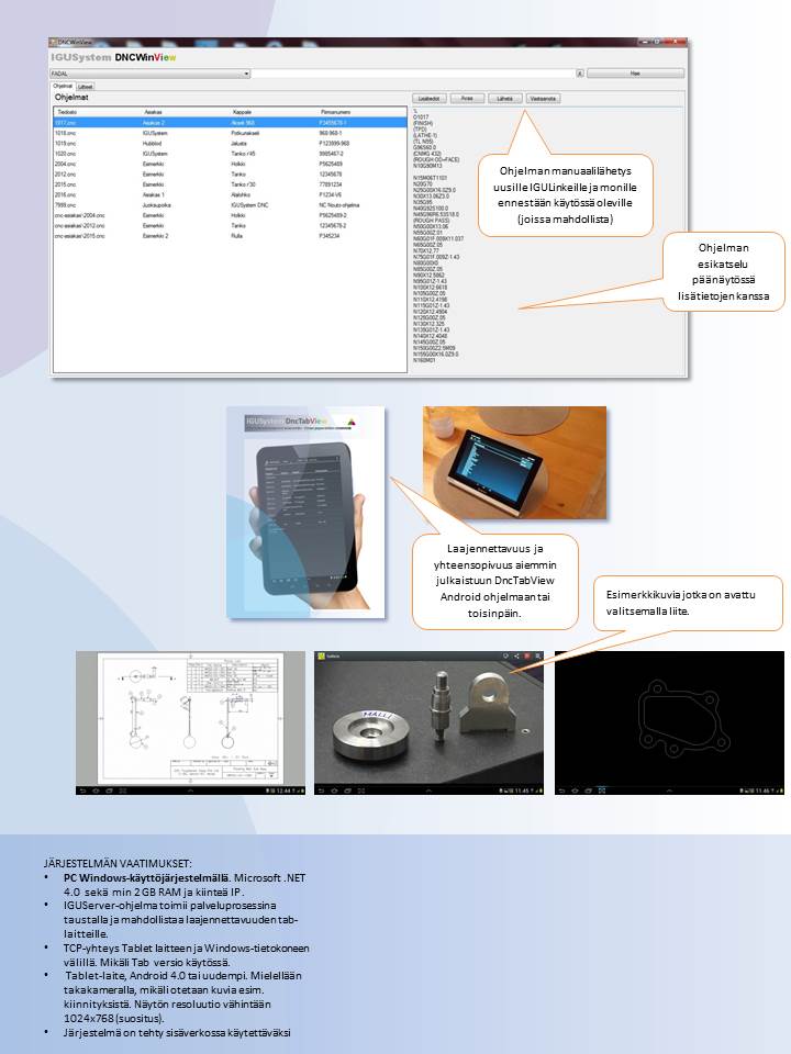 Yleisimpien tiedonkeruujärjestelmien (ADC) ja tiedonsiirtojärjestelmien (DNC) muutostyöt, varaosat ja järjestelmien uudelleenkytkentä ja niiden vaatima logiikkaohjelmointi. DNC tiedonsiirtolinkit NC ohjelmien siirtoon. IGULink-järjestelmä tuotantoseisokkien välittömään havainnointiin sekä konetilojen seurantaan ja analysointiin. Datan tuottaminen räätälöidylle pilvipalvelulle ja IguADC sovellukselle. DNC Android ja DNC Windows ohjelmat NC ohjelmien ja niiden lisätietojen hallintaan. Tekoäly konepajoissa.CNC-ohjelman siirto. langaton CNC siirto. DNC-ohjelmasiirto. CNC tiedonsiirto WiFi. työstökone ohjelmansiirto. usb cnc tiedonsiirto. CNC-ohjelmien langaton siirto. NC-ohjelmien langaton siirto. RS232 CNC. RS-232 CNC. USB CNC. Wifi CNC